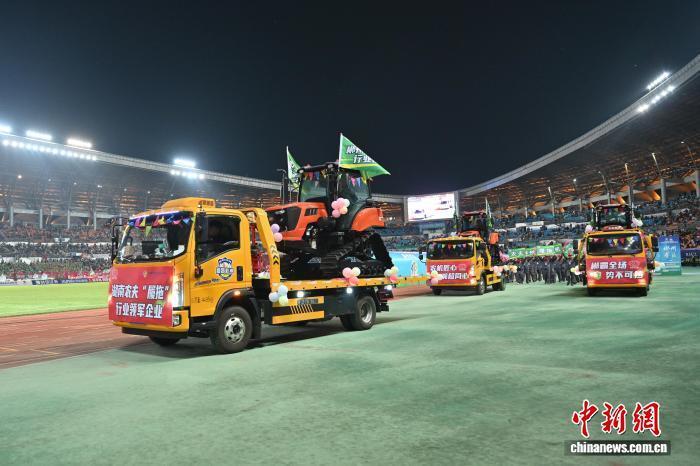 中新社郴州10月25日电 (记者 鲁毅)山地智能农机、固定翼无人机、数控机床组成的方阵,24日晚缓缓驶过湖南郴州市体育中心绿茵场边。这场别开生面的“装备巡游”,拉开了2025湖南省足球联赛(简称“湘超联赛”)郴州队主场对阵娄底队的序幕。 10月24日晚,湘超联赛郴州队主场对阵娄底队赛场上,当地...